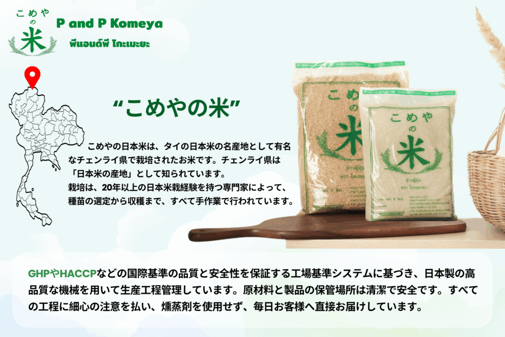 เราทำสัญญากับเกษตรกรใน จ.เชียงราย และเราดูแลเกษตรกรที่ทำสัญญาอย่างใกล้ชิด ตั้งแต่การจัดการเมล็ดพันธุ์ การเพาะกล้าไม้ จนถึงการเก็บเกี่ยว และการสีข้าว หลังการเก็บเกี่ยวเราใส่ใจในการดึงเอารสชาติดั้งเดิมของข้าวญี่ปุ่นออกมา เพื่อส่งมอบข้าวญี่ปุ่นที่ปลอดภัย คุณภาพสูง และอร่อยให้กับผู้บริโภค เราทำการปรับปรุง วิจัย รวมถึงจัดส่งผู้เชี่ยวชาญด้านการปลูกข้าวจากประเทศญี่ปุ่นมาให้คำแนะนำ